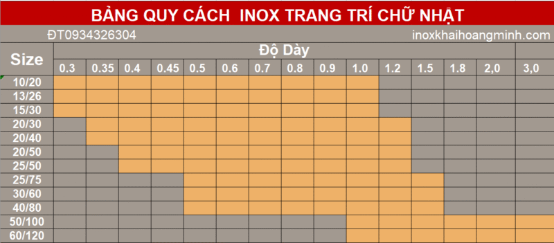 Bảng qui cách tiêu chuẩn hàng hộp vuông, chữ nhật inox trang trí 201 304
